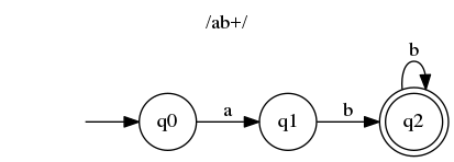 Note that for string "aa" after consuming first character we still have one a to go. But there is not transition outgoing from q1, so we cannot accept the string. This might be counterintuitive to what you know from programming, but in reality /a/ regular expression is actually /\Aa\z/. We are going to treat them this way in the rest of the post.