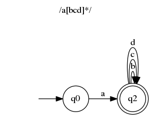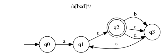 Sounds stupid? Well, it does for me. It means that after consuming a in last example (/a[bcd]*/) we are both in state q1 and q22. Fortunately, there is a simple algorithm to get rid of epsilon transitions. It creates automaton that is more “precise” but is less pretty and harder to read. It is also usually easier to build some automata from regular expressions using epsilon transitions.