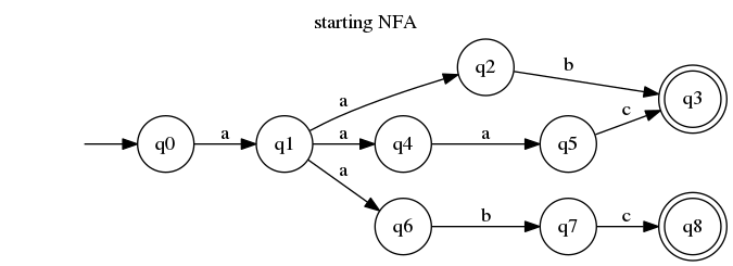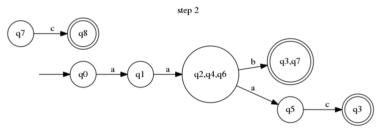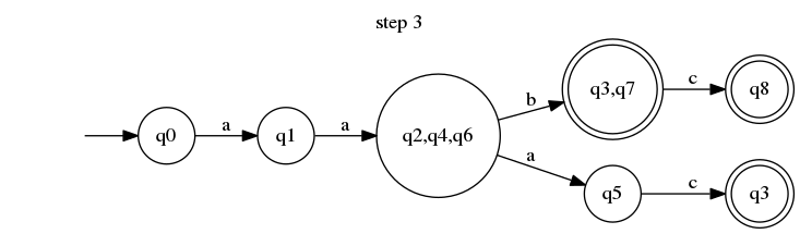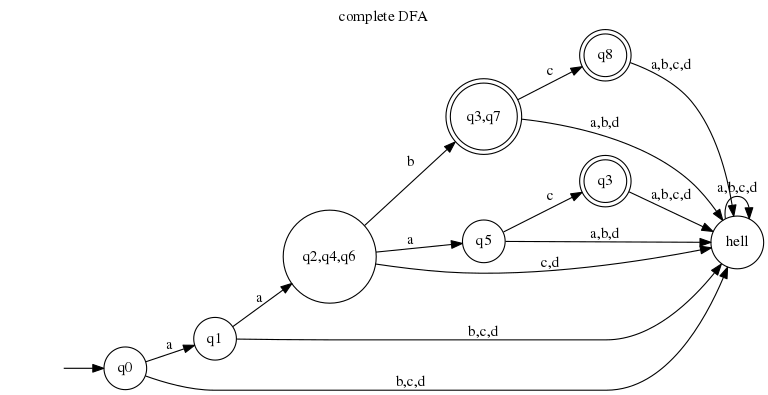 We can now enjoy a deterministic equivalent of our initial non-deterministic automaton. It became a bit simpler (7 states instead of 9 and 6 transitions instead of nine). By reverse engineering it into regular expression, we also have a simpler one! The regexp for NFA is /a(ab|aac|abc)/ and for our DFA is /aa(bc?|ac)/.