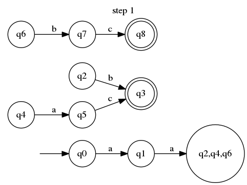The determinization process takes advantage of that definition and makes it apparent by creating a new state denoting that. For convenience, we’ll call it q2,q4,q6. We create a transition from q1 to our new state via a and delete all the other a-labeled transitions originating from q1 This is how our automaton look after this first step: