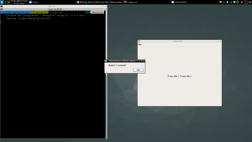 To check how to start with Rust and QML, I decided to try and compile an example that was given to me by Qt Creator when I created my first Qt Quick project. Qt Quick is a set of standard components for QML development. The program consists of two buttons, which we can click and appropriate message appears in new alert window. Nothing fancy, but enough to have something running that is more verbose than just an empty window.