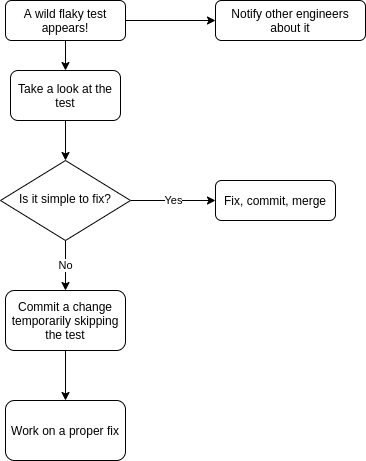 - Now the person responsible for fixing the test (BTW it may be a different person from the one who spotted the flakiness) is trying to understand what happened and how to fix it. There are many possible outcomes here - the test might be repaired but it also can be deleted it it’s flaky by it’s nature (for example testing something random). Or it can be rewritten because we cannot find why it fails sometimes but there’s some other way to tests this thing it tests. Important thing is that it’s not an option to “just leave it, it shouldn’t fail that often”.